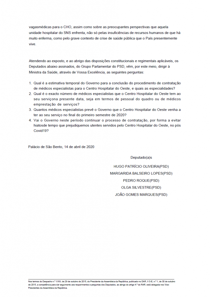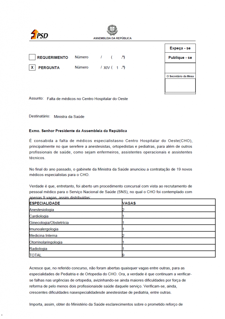 Na pergunta entregue esta terça-feira, 14, na Assembleia da República (AR), os social-democratas eleitos pelo círculo de Leiria afirmam que no concurso com vista ao recrutamento de pessoal médico para o Serviço Nacional de Saúde foram atribuídas ao CHO vagas para dois anestesiologistas, dois clínicos de Medicina Interna e uma para as especialidades de Cardiologia, Ginecologia/Obstetrícia, Imunoalergologia, Otorrinolaringologia e Radiologia.