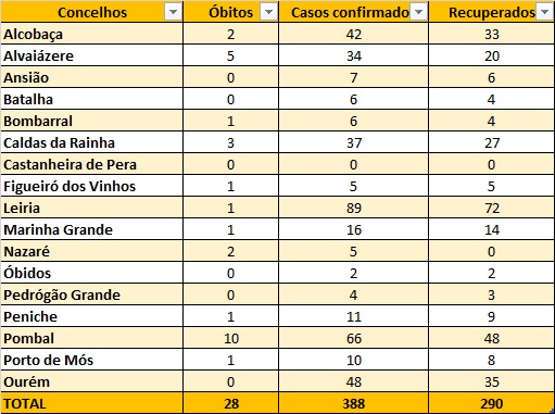 A região (distrito de Leiria e concelho de Ourém) tem 388 casos identificados, segundo dados divulgados pela Comissão Distrital da Proteção Civil de Leiria, Comunidade Intermunicipal do Oeste e municípios, dos quais 290 já recuperaram, ou seja, mais de 74% dos casos. As duas recuperações verificadas desde o dia de ontem aconteceram em Leiria e Figueiró dos Vinhos.