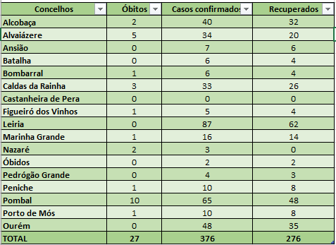 Os concelhos da Batalha e de Leiria registaram cada um, desde ontem, mais um caso positivo de infeção pelo novo coronavírus, que eleva para 376 o total de casos confirmados até à data.