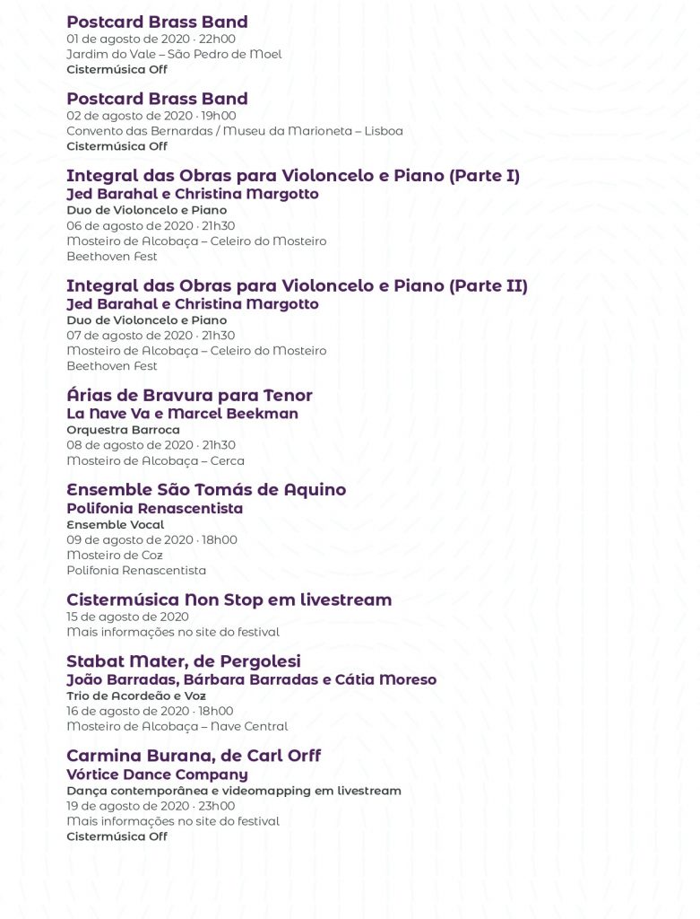 A organização entendeu ainda cortar os preços das entradas em 50%, oscilando os valores dos ingressos entre os cinco, os oito e os 10 euros, mantendo-se gratuitos os concertos a realizar em locais de culto (a nave central do Mosteiro de Alcobaça e o Mosteiro de Cós).