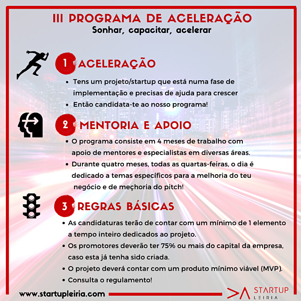 Segundo a Startup Leiria, o programa é aberto “a todas as startups que desejam aumentar vendas, expandir investimentos, ajustar estratégias ou até mesmo profissionalizar as suas operações e conexões”.