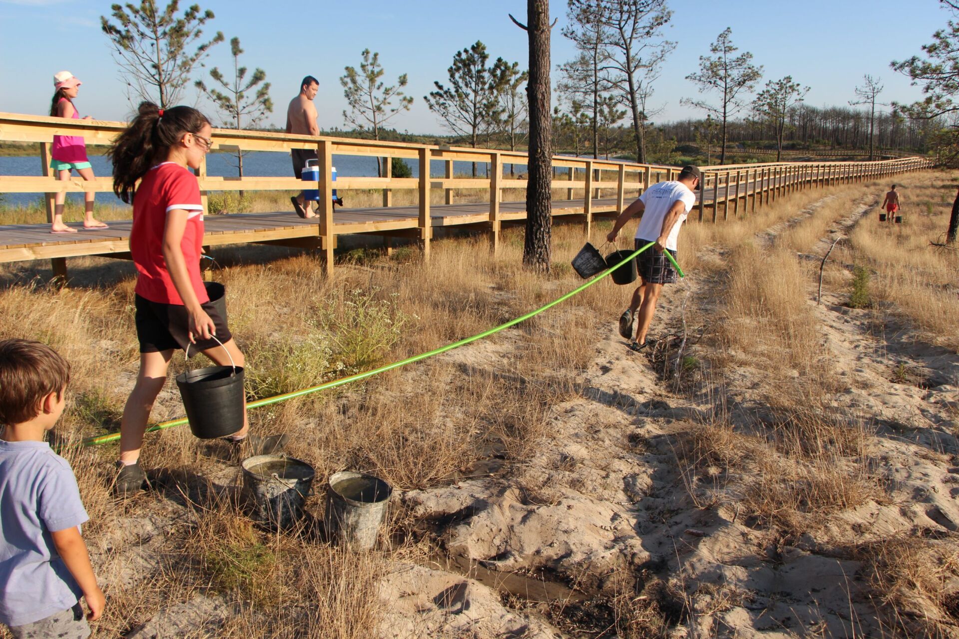 Voluntários regam árvores junto à Lagoa da Ervedeira para as salvar do calor