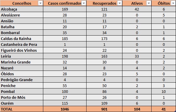 Leiria e Caldas da Rainha são os únicos municípios em que se registam alterações. Ambos têm mais um caso positivo face ao dia de ontem e também mais uma recuperação.