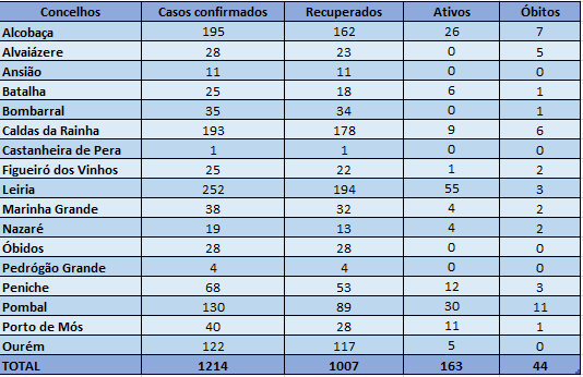 Com os dados apurados pelas autoridades locais de saúde e municípios, o total de casos de confirmados desde o início da pandemia no distrito de Leiria e no concelho de Ourém cifra-se em 1.214.