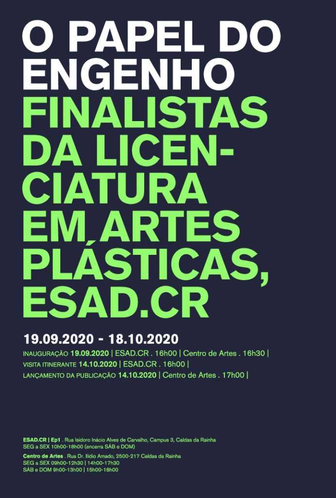 A exposição “O papel do engenho”, inaugurada no dia 19 de setembro, apresenta os trabalhos realizados pelos alunos finalistas, em 2020, em Artes Plásticas, da Escola Superior de Arte e Design de Caldas da Rainha (ESAD.CR), no âmbito da disciplina de projeto final.