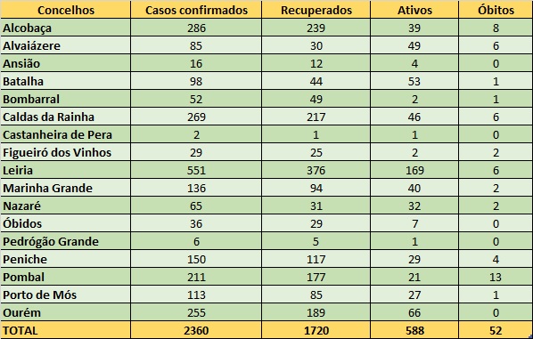 Desde ontem, foram registados mais 66 casos na região de Leiria (distrito de Leiria e concelho de Ourém). Aos 33 do concelho de Leiria somam-se mais sete em Ourém, cinco na Marinha Grande, quatro na Batalha e em Alcobaça, três na Nazaré e dois em Porto de Mós.