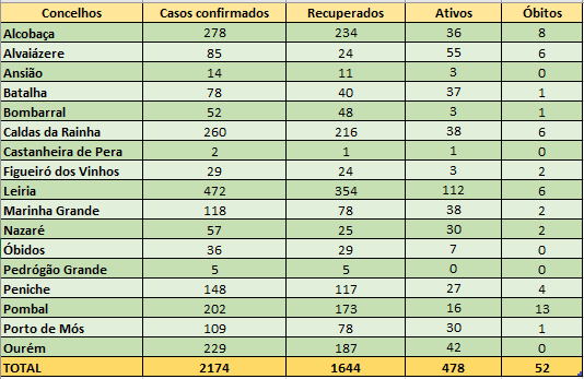 Há ainda registo de nove casos em Caldas da Rainha, dois em Porto de Mós, dois em Óbidos, um em Peniche e um em Pombal. Desde o início da pandemia, foram contabilizados 2.174 casos de Covid-19 na região.
