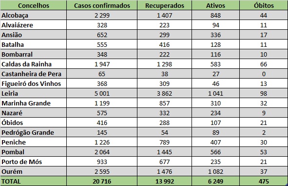 Desde o início da pandemia por SaRs-CoV-2 já faleceram na região de Leiria (distrito de Leiria e concelho de Ourém) 475 pessoas com causas relacionadas com a doença.