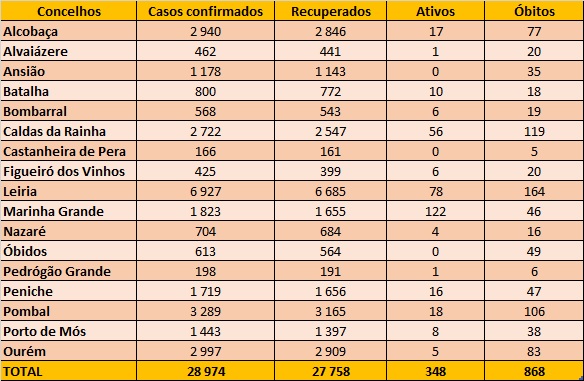 Entre as recuperações, Alcobaça, que já foi dos municípios com maior número de pessoas infetadas, assinala 39 recuperações, diminuindo o total de ativos para 17.