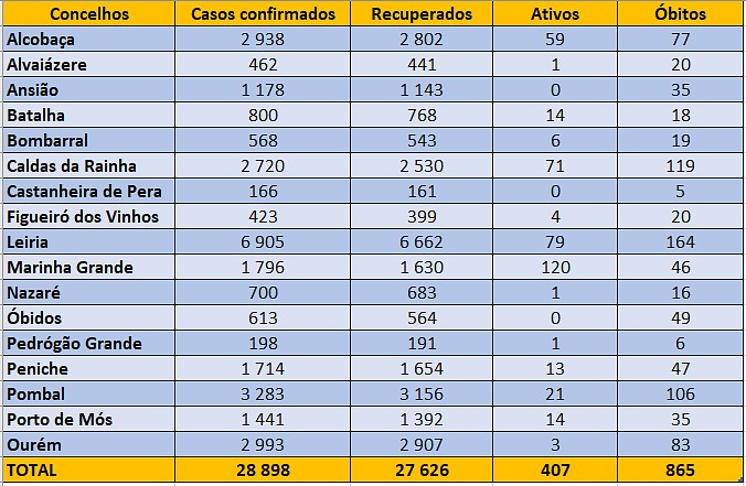 Os dados reportados pelo REGIÃO DE LEIRIA referem-se aos 16 concelhos do distrito de Leiria e ao concelho de Ourém que, apesar de pertencer ao distrito de Santarém, mantém com Leiria grande proximidade e tem o Hospital de Santo André como hospital de referência.