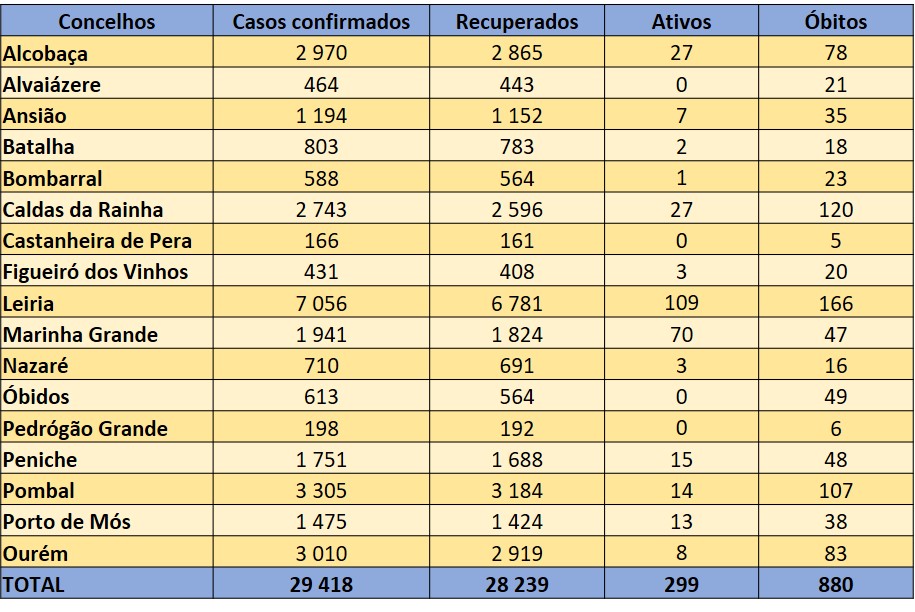 Os dados divulgados pelo REGIÃO DE LEIRIA têm por base o balanço divulgado pela Comissão Distrital de Proteção Civil, mas também a informação avançada pelos municípios que fazem a atualização diária das respetivas situações epidemiológicas.