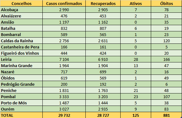 Desde o início da pandemia, em março de 2020, a região de Leiria tem 29.732 casos confirmados e 28.727 recuperações. Há 881 vítimas a lamentar e 125 doentes permanecem com a infeção ativa (mais cinco do que ontem).