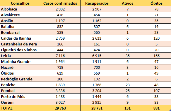 Desde o início da pandemia, em março de 2020, a região de Leiria tem 29.763 casos confirmados e 28.751 recuperações. Há ainda 881 vítimas a lamentar.