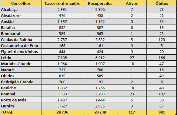 Desde o início da pandemia, em março de 2020, a região de Leiria tem 29.736 casos confirmados e 28.738 recuperações. Há 881 vítimas a lamentar e 117 doentes permanecem com a infeção ativa (menos 8 do que ontem).