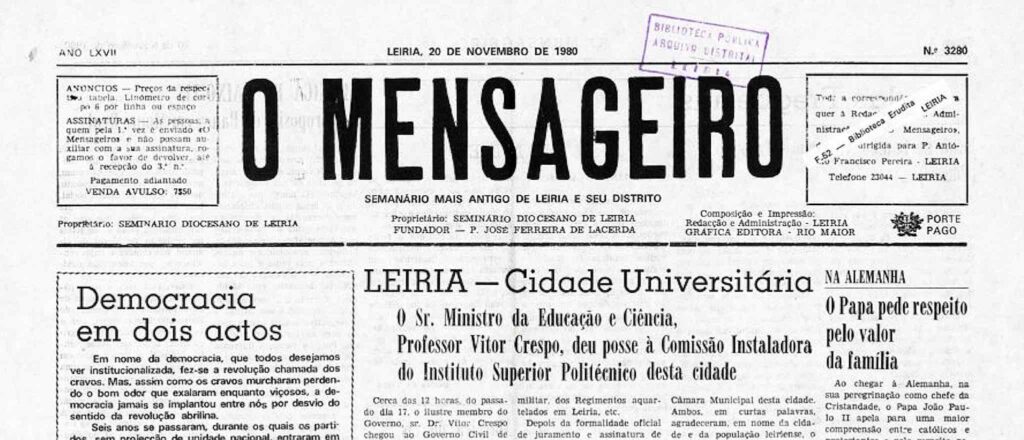 No arranque da hemeroteca digital Arquivo Digital de Leiria ficará consultável o acervo integral que resultou dos 99 anos de existência de ”O Mensageiro” e dos 80 anos de ”A Voz de Domingo”, publicações da Diocese de Leiria-Fátima que desapareceram em 2013 para dar lugar a um novo título, “Presente”, que também deixou de ser publicado em 2018.