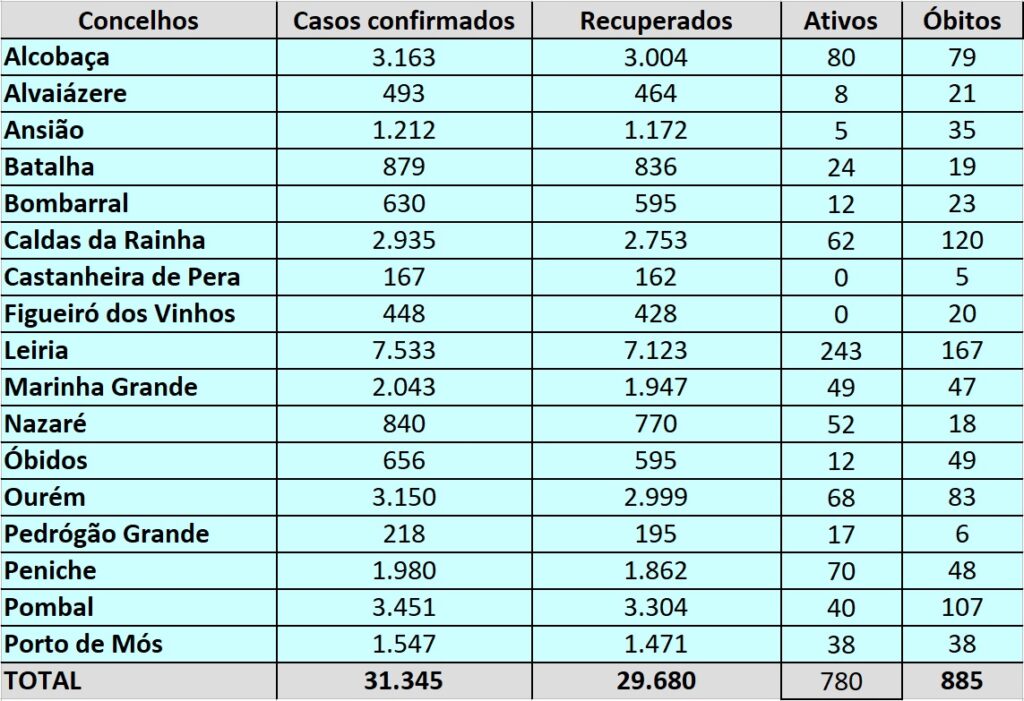 A região de Leiria registou desde o início da pandemia, em março de 2020, 31.345 casos confirmados, 29.680 recuperações e 885 óbitos. Esta quinta-feira há 780 casos ativos.