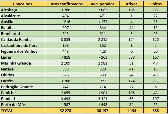 Desde o início da pandemia, a região de Leiria acumulou 32.278 casos de infeção pelo SARS-CoV-2, tendo registado 888 óbitos. Recuperaram até ao momento 30.197 pessoas infetadas.