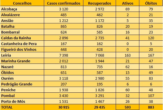 Os dados divulgados pelo REGIÃO DE LEIRIA referem-se aos 16 concelhos do distrito de Leiria e ao concelho de Ourém que, apesar de pertencer ao distrito de Santarém, mantém com Leiria grande proximidade e tem o Hospital de Santo André como hospital de referência.