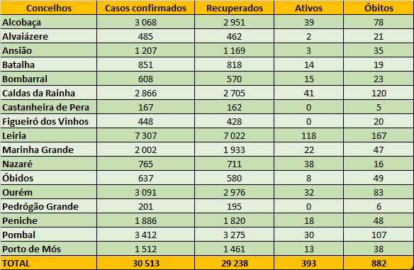 Os dados divulgados pelo REGIÃO DE LEIRIA referem-se aos 16 concelhos do distrito de Leiria e ao concelho de Ourém que, apesar de pertencer ao distrito de Santarém, mantém com Leiria grande proximidade e tem o Hospital de Santo André como hospital de referência.