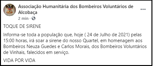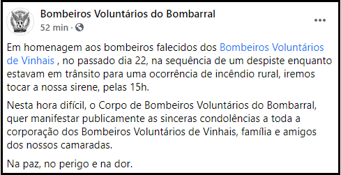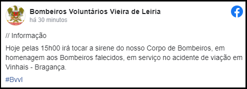 As corporações de bombeiros da região de Leiria associam-se a esta tarde a uma homenagem nacional em memória dos dois bombeiros de Vinhais falecidos na quinta-feira, com um toque de sirene nos quartéis.