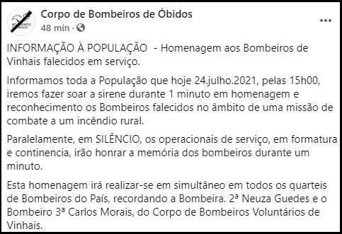 “Em tributo nacional, a Confederação solicitou que todos os quartéis coloquem as bandeiras a meia haste até ao final do dia do funeral dos bombeiros e que soem as sirenes à hora do início das respetivas exéquias”, refere a Liga em comunicado.