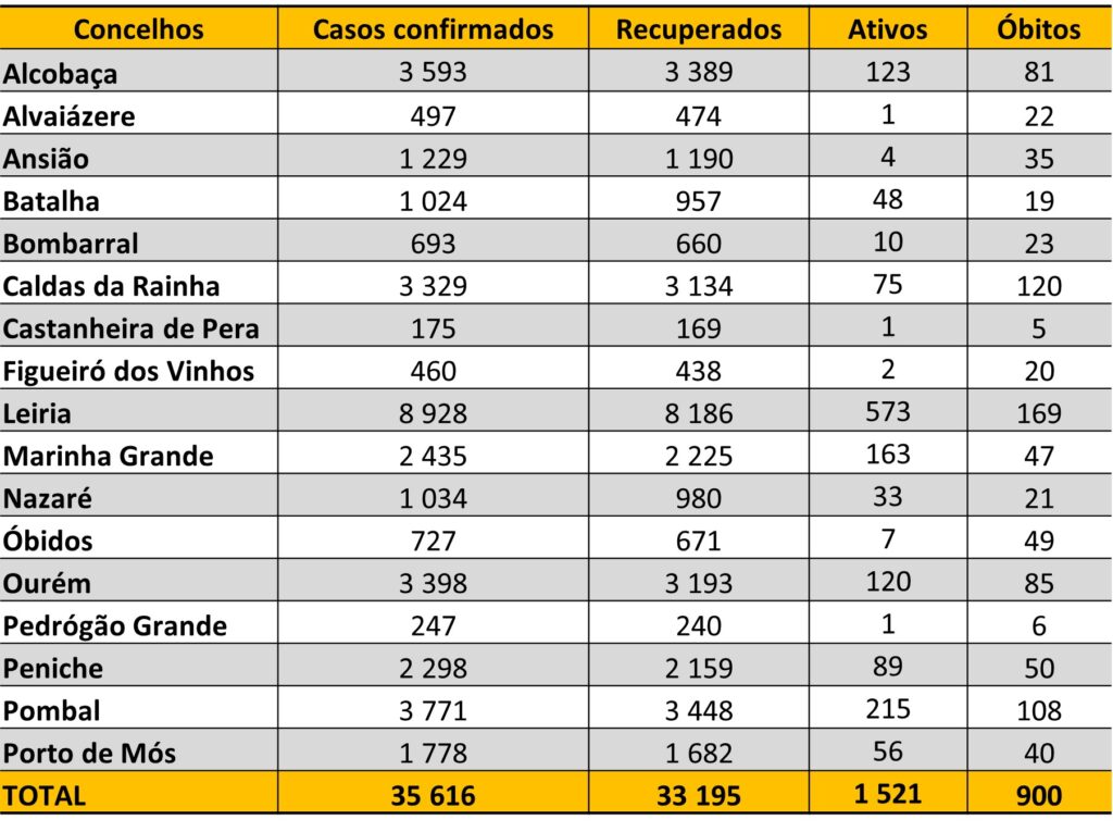 O balanço das últimas 24 horas, porém, não inclui alterações nos concelhos que integram o Agrupamento de Centros de Saúde Pinhal Litoral, ou seja, não foram atualizados os dados referentes a Batalha, Leiria, Marinha Grande, Pombal e Porto de Mós.