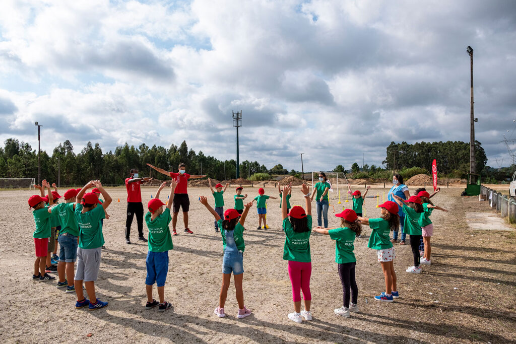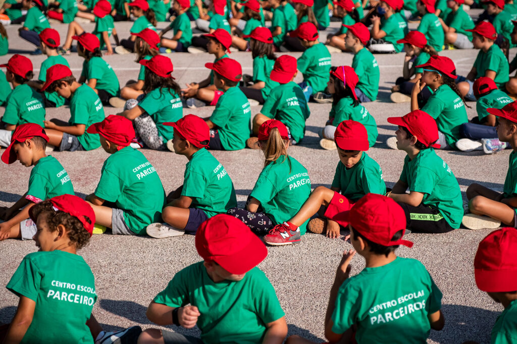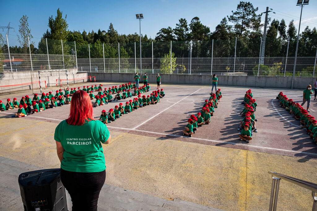 Foi depois de tocar a campainha às 9 horas, os alunos entrarem e voltarem equipados com bonés e t-shirts verdes, que começaram as atividades desportivas dedicadas ao tema abraçado pela escola este ano: “Parceiros do Desporto e do Bem-Estar”, em parceria com a Câmara de Leiria.