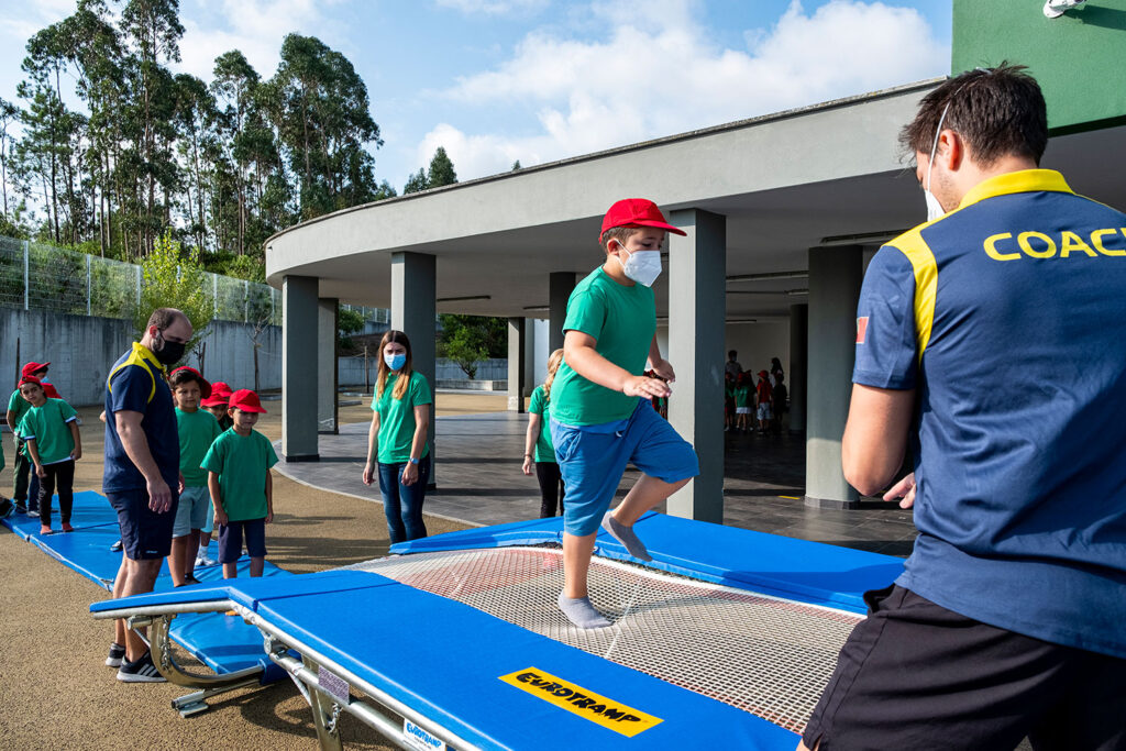 Divididos em grupos, os 137 alunos foram rodando entre as distintas atividades. No ténis, o professor Frederico Lopes ensinava a ter contacto com a bola para depois partir para o uso das raquetes. Nos trampolins, Rui Branco dava instruções aos alunos sobre o tipo de salto a realizar.