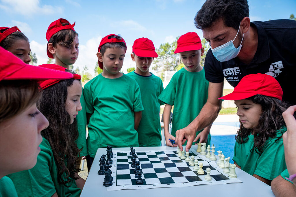 Do telheiro do centro escolar, ouviam-se gritos em japonês. Era a atividade dedicada ao karaté. Nas traseiras edifício, estavam em cima da mesa os tabuleiros e as peças de xadrez que pediam concentração. Por ali, a maioria experimentou o jogo pela primeira vez. Foi o caso do Guilherme Marques, que gosta de aprender a manusear as peças, mas revelou estar ansioso para ir saltar no trampolim.