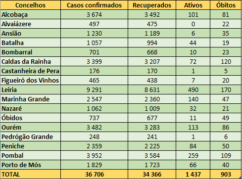 O concelho de Leiria volta a destacar-se com mais 29 infeções, seguindo-se Caldas da Rainha com mais 19 e Alcobaça com mais 16. Estes três municípios concentram também a maioria das recuperações, sendo que os dados referentes a Caldas da Rainha e Alcobaça são relativos aos últimos dois dias.