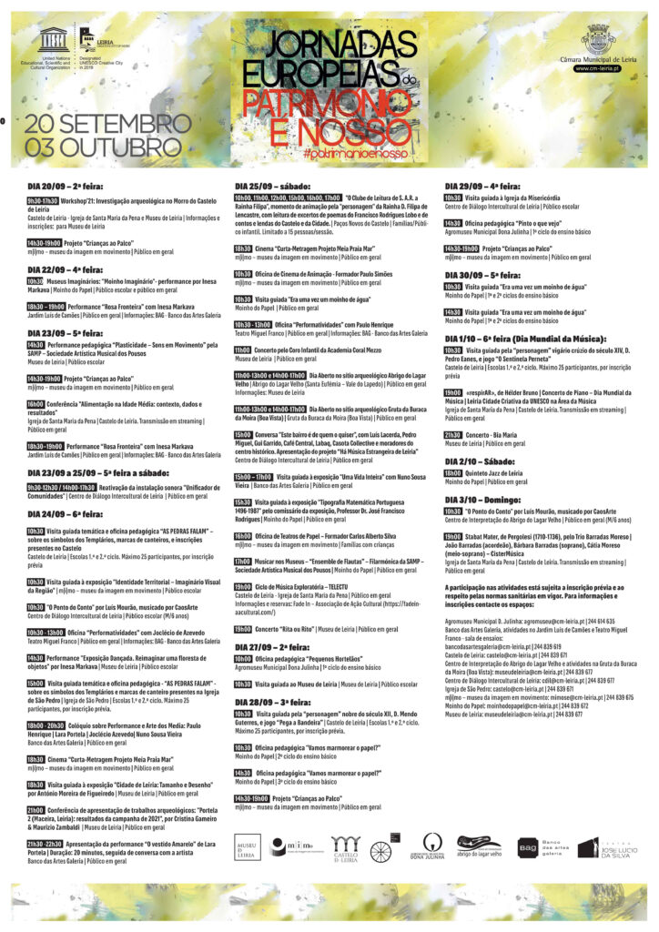 Além de Leiria, há atividades programadas para Alcobaça, Ansião, Caldas da Rainha, Nazaré, Peniche, Pombal, Porto de Mós, que podem ser consultadas aqui, onde podem ser encontradas mais informações sobre as muitas propostas preparadas para as Jornadas Europeias do Património.