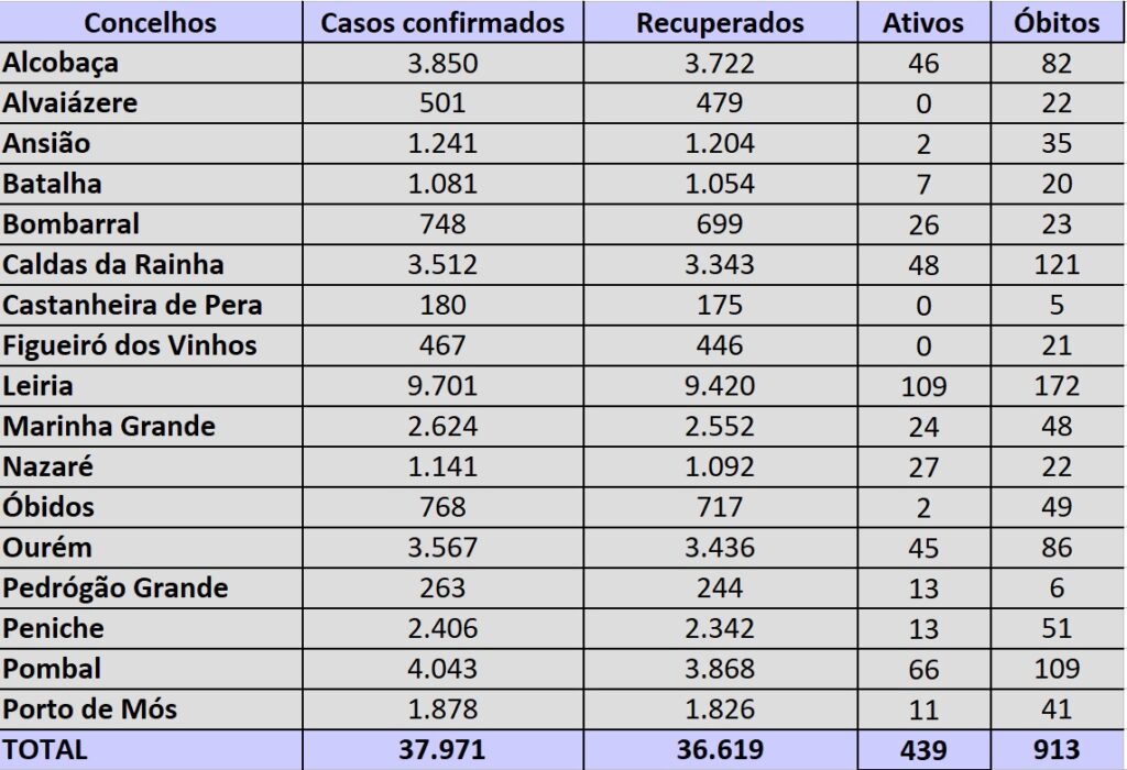 Os dados divulgados pelo REGIÃO DE LEIRIA referem-se aos 16 concelhos do distrito de Leiria e ao concelho de Ourém que, apesar de pertencer ao distrito de Santarém, mantém com Leiria grande proximidade e tem o Hospital de Santo André como hospital de referência.