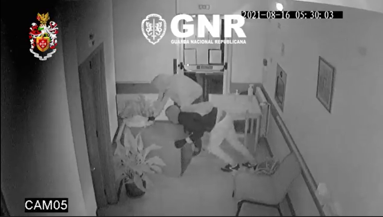 Na nota de imprensa enviada às redações, a força de segurança divulga um vídeo (em baixo) com imagens de câmaras de vigilância onde é possível ver os suspeitos a entrar num edifício, disfarçados, e a sair com bens materiais.