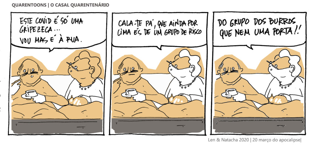 Durante 15 meses, entre março de 2020 e maio de 2021, a ilustradora Natacha Costa Pereira e o economista Leonardo Cruz, ambos de Alcobaça, criaram e publicaram mais de 400 cartoons relacionados com a Covid-19 nas páginas de Facebook e Instagram “Quarentoons”.