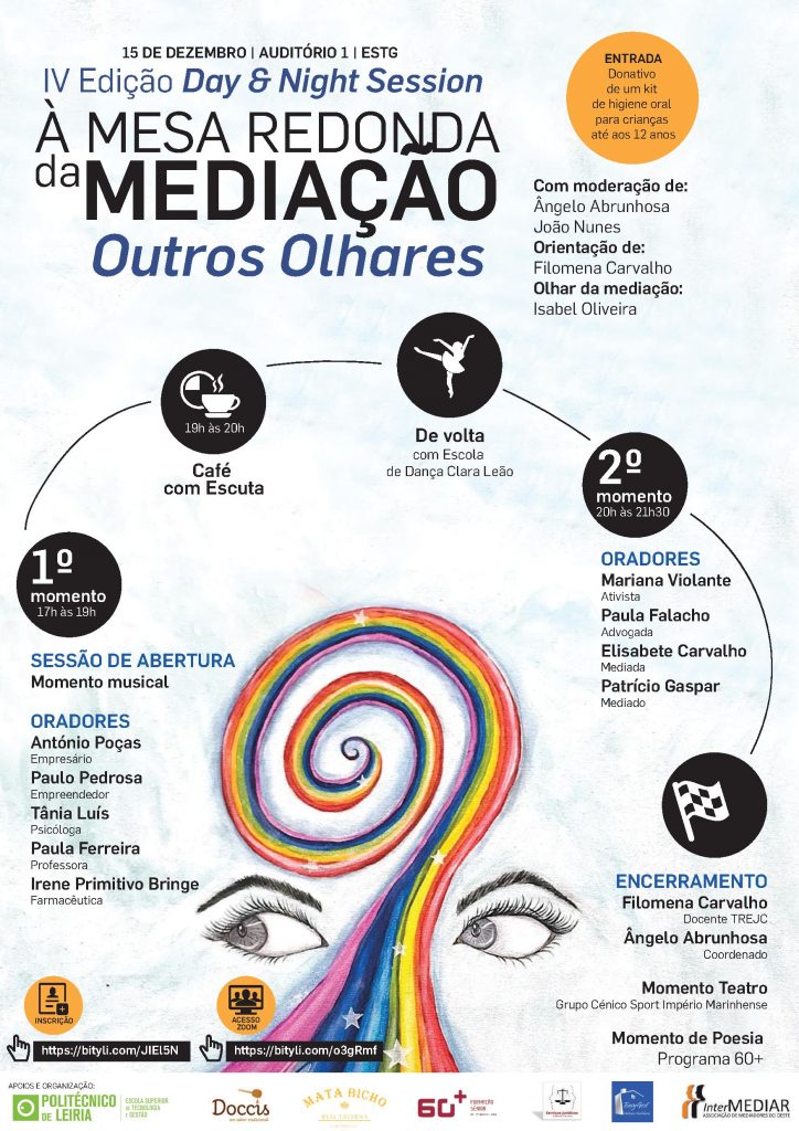 A iniciativa “À mesa-redonda da Mediação: outros Olhares” é o tema do “Day & Night Session”, promovida pelos estudantes do 2º ano do curso técnico superior profissional de Serviços Jurídicos, da Escola Superior de Tecnologia e Gestão de Leiria.