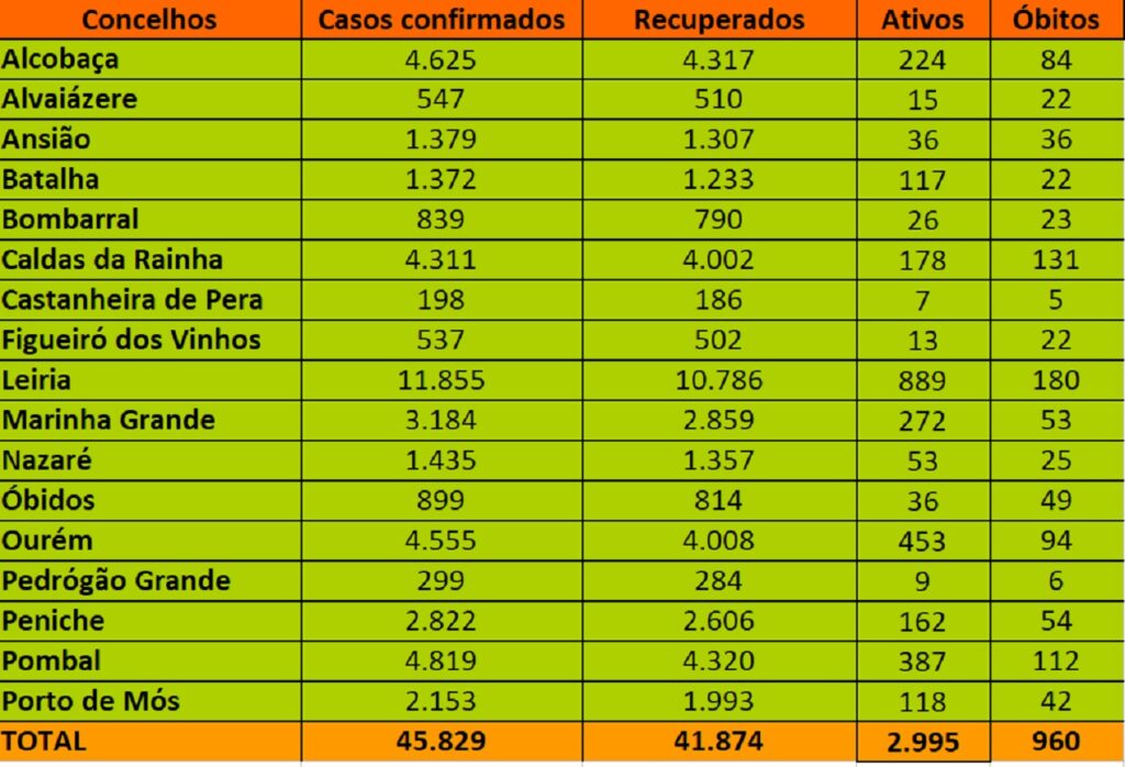 Os dados divulgados pelo REGIÃO DE LEIRIA referem-se aos 16 concelhos do distrito de Leiria e ao concelho de Ourém que, apesar de pertencer ao distrito de Santarém, mantém com Leiria grande proximidade e tem o Hospital de Santo André como hospital de referência.