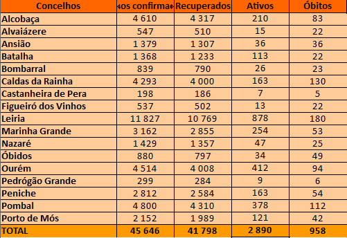 Os dados tornados públicos refletem 77 recuperações de doentes em Pombal, 53 em Alcobaça, 48 em Leiria, 39 em Caldas da Rainha, 12 em Peniche, 9 na MArinha Grande, 3 na Batalha e 2 em Porto de Mós.