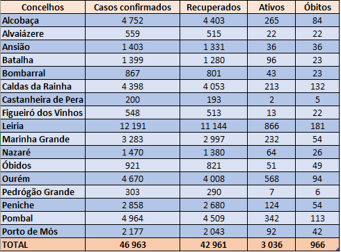 Os dados divulgados pelo REGIÃO DE LEIRIA referem-se aos 16 concelhos do distrito de Leiria e ao concelho de Ourém que, apesar de pertencer ao distrito de Santarém, mantém com Leiria grande proximidade e tem o Hospital de Santo André como hospital de referência.