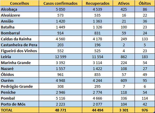 Desde o início da pandemia, em março de 2020, foram confirmados na região de Leiria 48.771 casos, dos quais 44.494 já recuperaram. Há 3.301 casos ativos e 976 óbitos a lamentar.