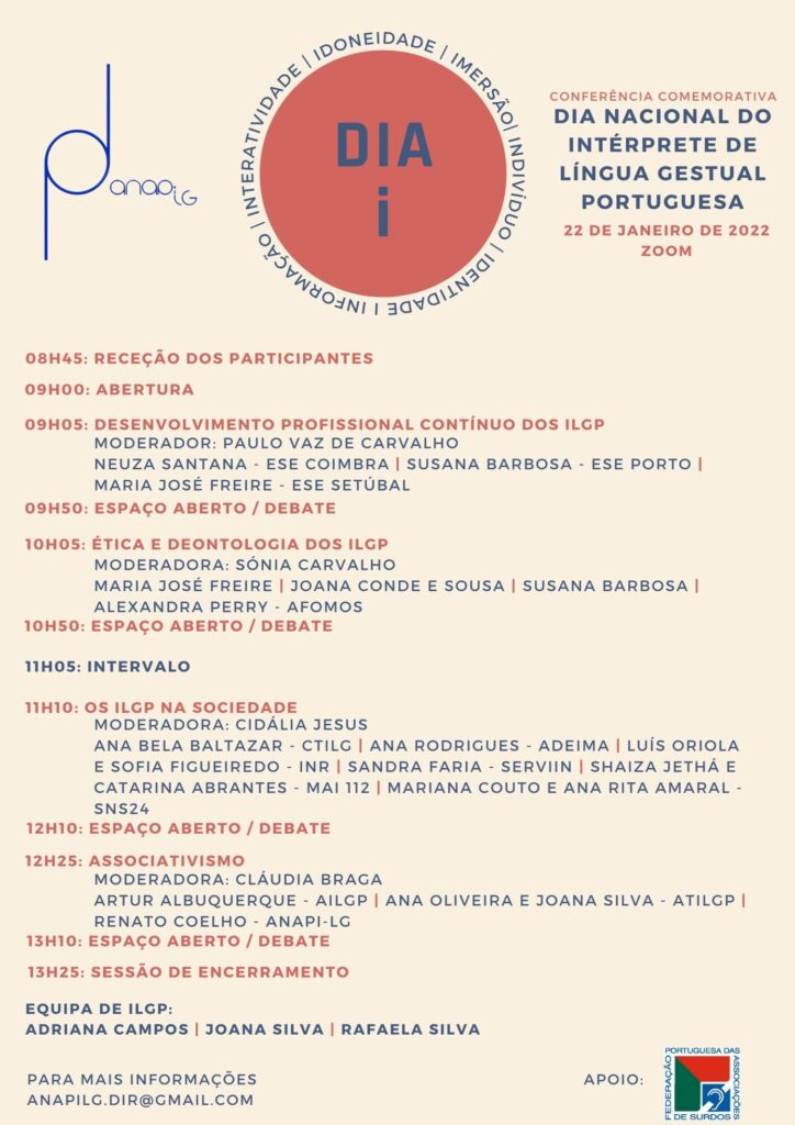 A iniciativa decorre online (zoom), entre as 8h45 e as 13h25, e conta com profissionais ligados à área para analisar os temas do desenvolvimento profissional contínuo dos intérpretes; Ética e deontologia do intérprete de LGP; O intérprete de LGP na sociedade; e Associativismo.