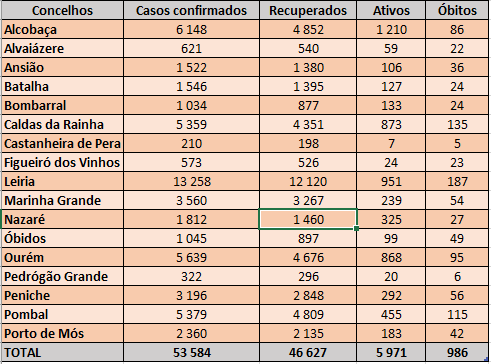 Entre os concelhos com maior aumento de novos casos, surgem, depois de Alcobaça, Ourém com mais 193 casos positivos de Covid-19, Caldas da Rainha (163) e Leiria (92). Foram ainda reportados 59 novas infeções na Nazaré, 55 em Pombal, 52 em Peniche, 34 na Marinha Grande, 16 em Porto de Mós e 15 na Batalha.