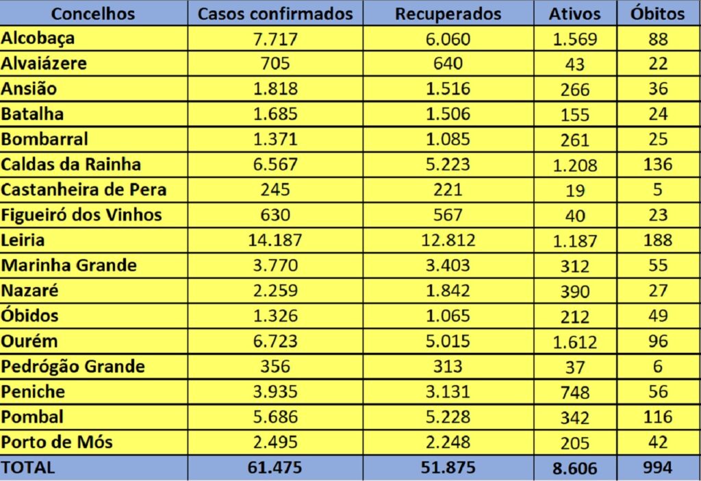 Quanto aos recuperados, o números mais elevados registaram-se em Alcobaça (315), Bombarral (166) e Caldas da Rainha (163). Com mais de meia centena de recuperações encontram-se igualmente Ansião (59) e Peniche (54).