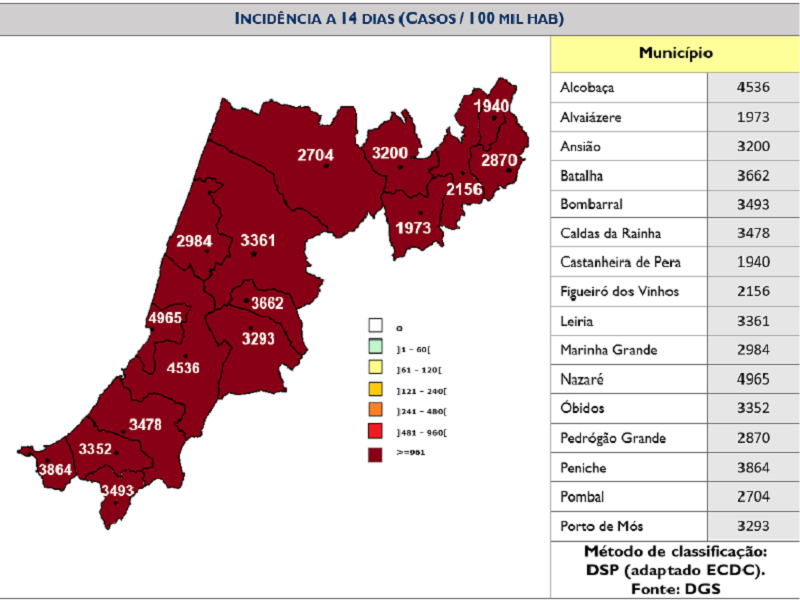 O concelho da Nazaré é o que regista maior incidência cumulativa e o de Alvaiázere menor incidência.