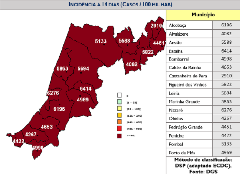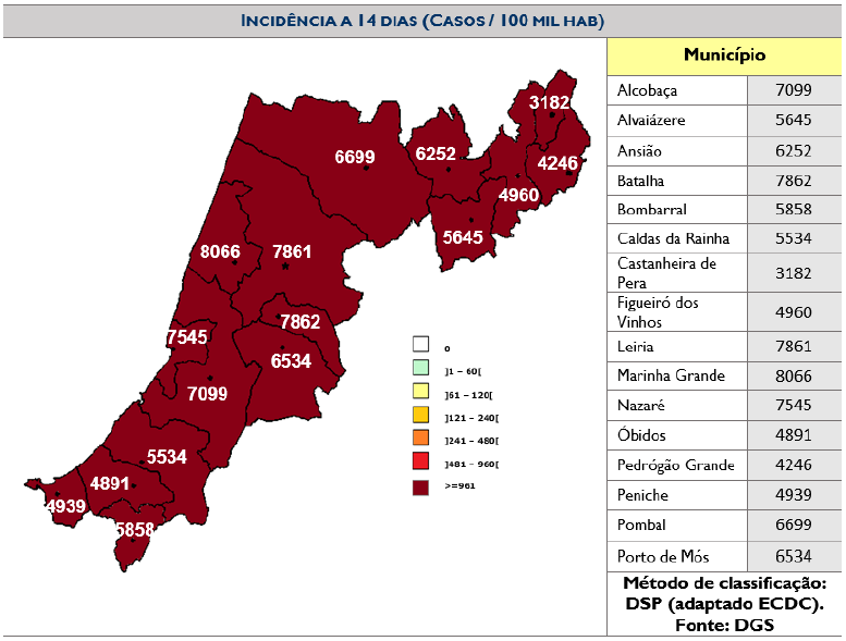No concelho de Leiria foram sinalizados 5.613 novos casos, seguindo-se os concelhos de Pombal (1.848), Ourém (1.827), Alcobaça (1.732), Marinha Grande (1.568), Caldas da Rainha (1.451), Porto de Mós (832), Peniche (680), Batalha (639), Nazaré (588), Ansião (414), Bombarral (337), Óbidos (296), Alvaiázere (190), Figueiró dos Vinhos (97), Pedrógão Grande (71) e Castanheira de Pera (23).