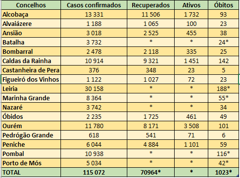 Os dados divulgados pelo REGIÃO DE LEIRIA referem-se aos 16 concelhos do distrito de Leiria e ao concelho de Ourém que, apesar de pertencer ao distrito de Santarém, mantém com Leiria grande proximidade e tem o Hospital de Santo André como hospital de referência.