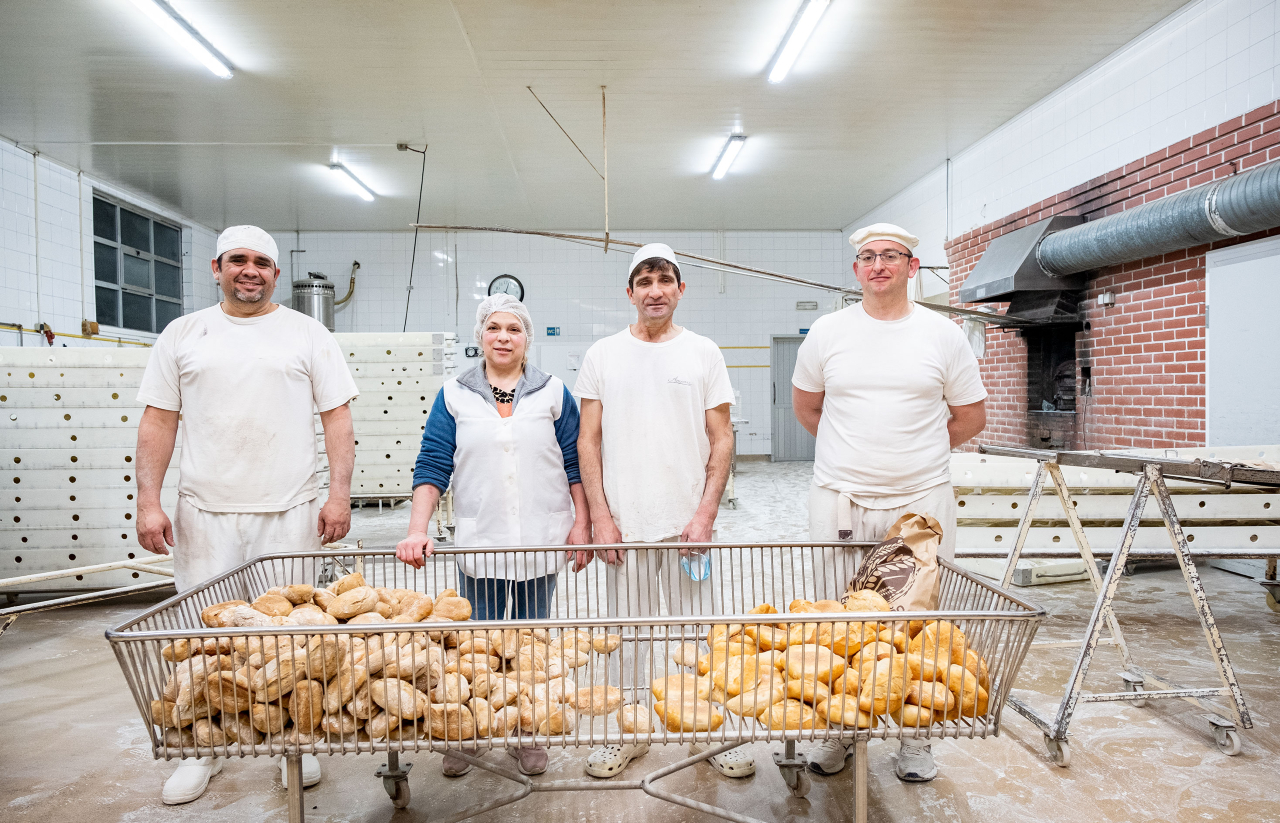 Às quatro horas da madrugada, quando Maria Luísa chega à panificadora, ainda a jornada de trabalho vai a meio. A distribuidora Amélia Clemente acaba de sair para duas horas e meia de correria a entregar pão ao domicílio. Os três homens da equipa continuam a levar massa ao forno mas a maior azáfama à volta da farinha já ficou para trás.