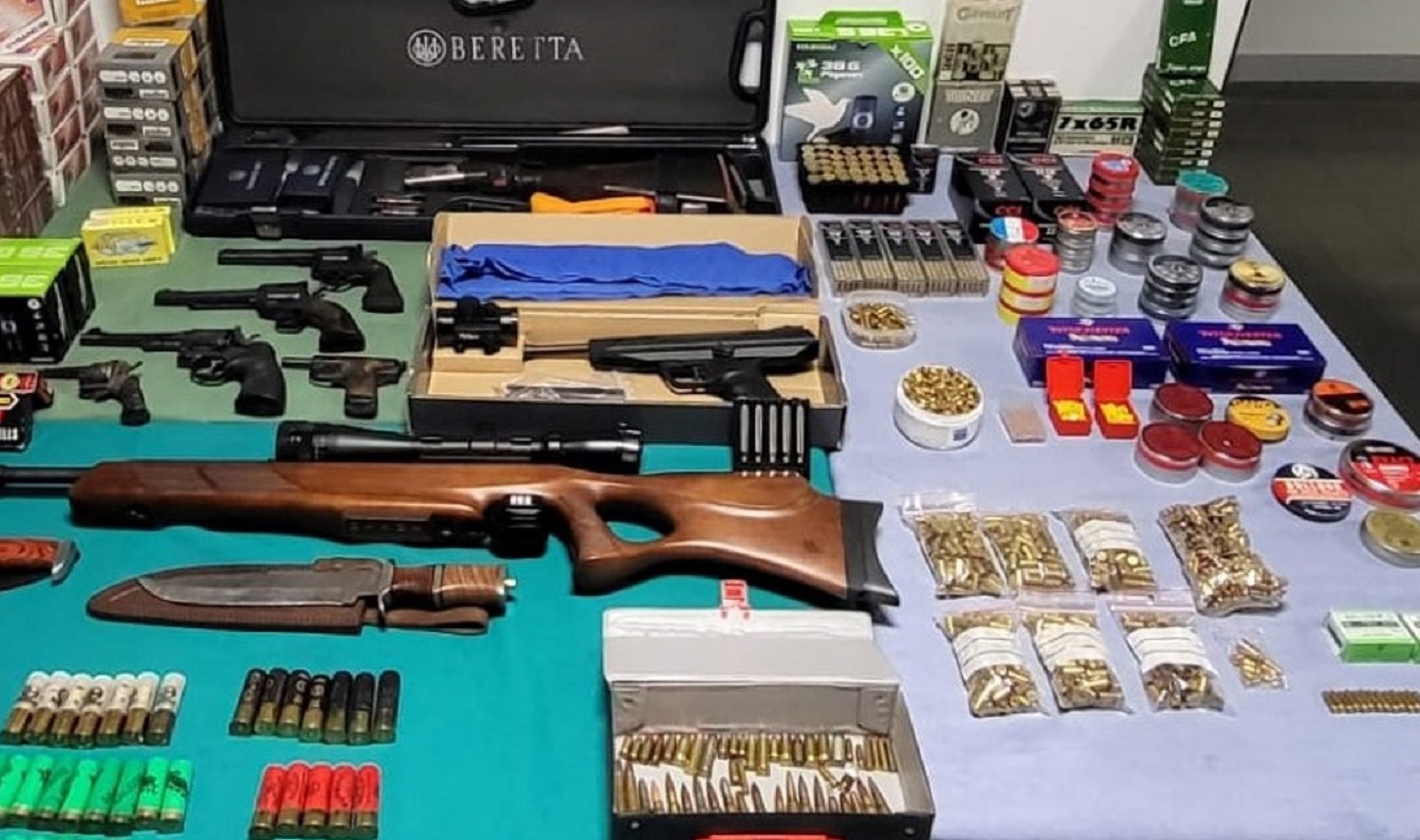 Na sequência de uma busca à residência foram apreendidos quatro revólveres, uma pistola, uma arma de caça, duas armas de ar comprimido, duas facas e diversas munições de diferentes calibres.