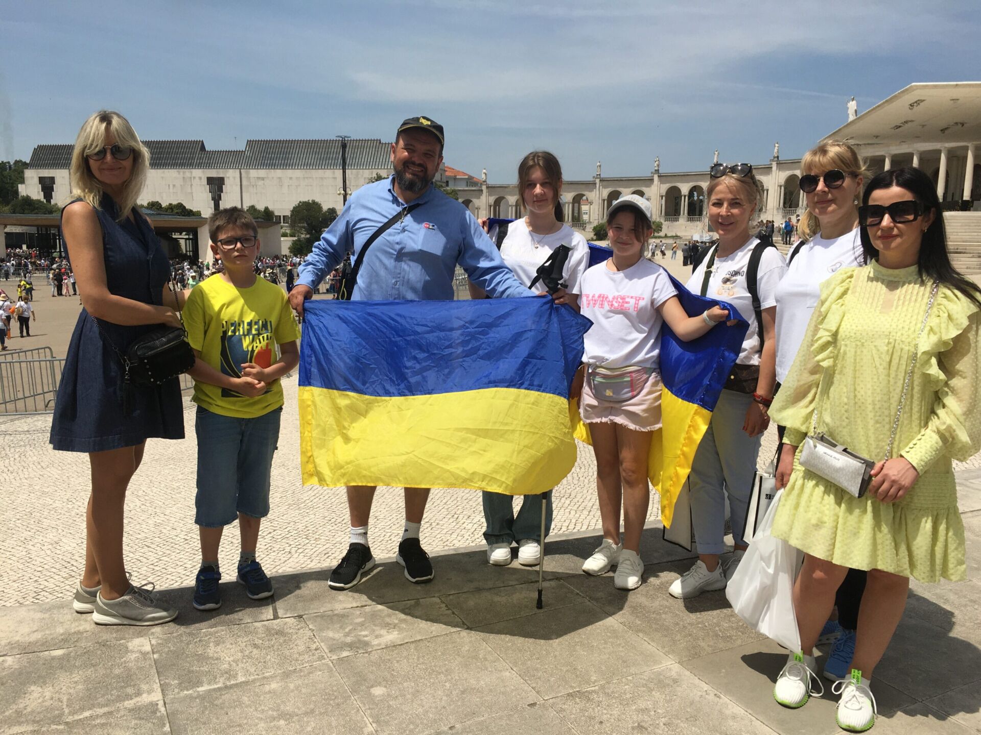 A poucos dias de completar 48 anos, Sergiy Zayika cumpriu mais uma peregrinação a pé a Fátima. Cinco dias de viagem, desde Lisboa, pelos Caminhos do Tejo, até integrar o grupo de bandeiras dos diferentes países e estandartes cujo cortejo percorreu o recinto do Santuário de Fátima, até ao altar, logo no início da celebração da Eucaristia. Desde 2014, que o engenheiro mecânico se põe a caminho, sempre acompanhado da bandeira do seu país, onde estão gravadas a caneta, as datas da sua peregrinação a pé. Vive em Portugal há 22 anos, usa camisa azul e boné preto com brasão da Ucrânia, enquanto o filho, já nascido em Portugal, enverga uma t-shirt amarela.