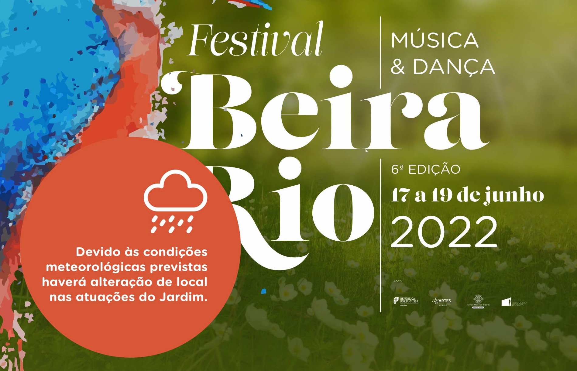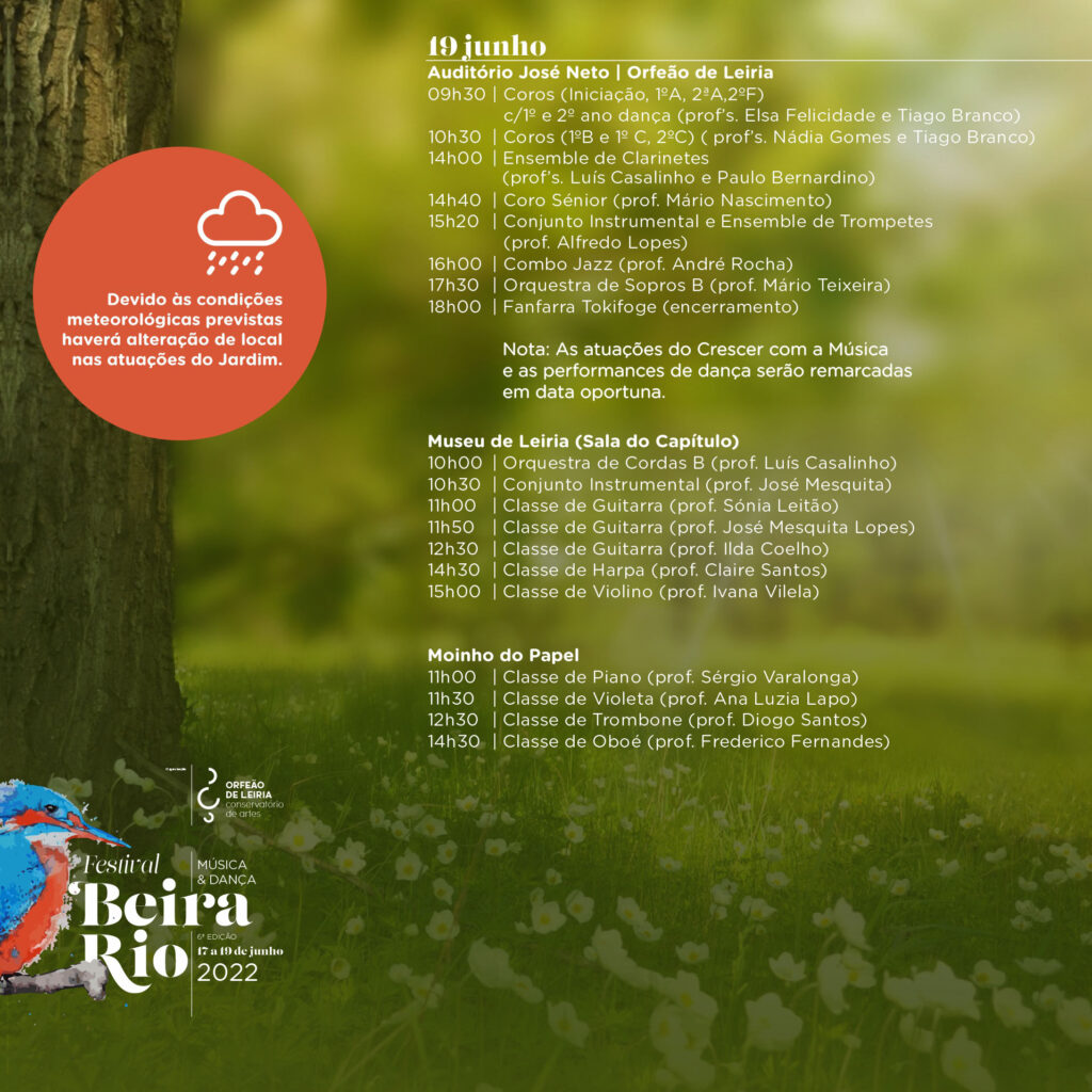 Desta forma, a programação prevista para sábado e domingo, dia 18 e 19 de junho, no Jardim de Santo Agostinho, no âmbito do festival Beira Rio, foi alterada para o Auditório José Neto, no Orfeão de Leiria. Mantêm-se as atuações previstas para o Museu de Leiria, Igreja de Santo Agostinho e Moinho do Papel.