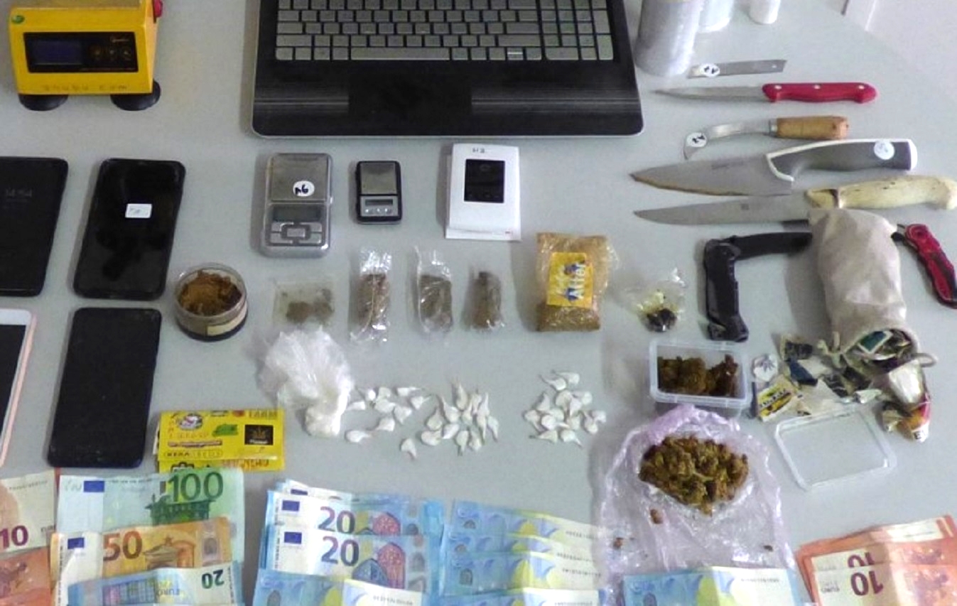No final, foram apreendidas 154 doses de haxixe, 68 doses de cocaína, oito doses de canábis, 2.350 euros em numerário, duas balanças digitais, uma prensa extratora de óleo de canábis, quatro facas utilizadas no corte das drogas, e artigos utilizados na preparação e embalagem de doses individuais.